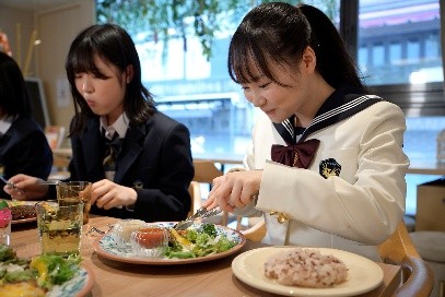 1階の「ココロゴトカフェ」は、生徒専用の学食としても親しまれています。栄養たっぷりのランチを囲んで、自然と会話が広がる、生徒たちの大切な交流の場です。