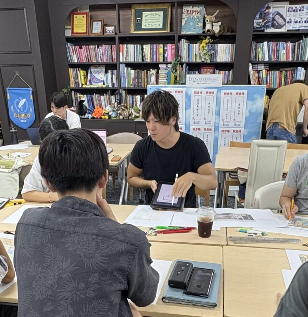 本日のイラスト同好会は、特別講師として一級建築士の美谷先生をお迎えしました。先生からは、建築やデザインの基礎にも通じる「一点透視図法」を学び、実際にアニメの主人公の部屋を描いてみる体験に挑戦。