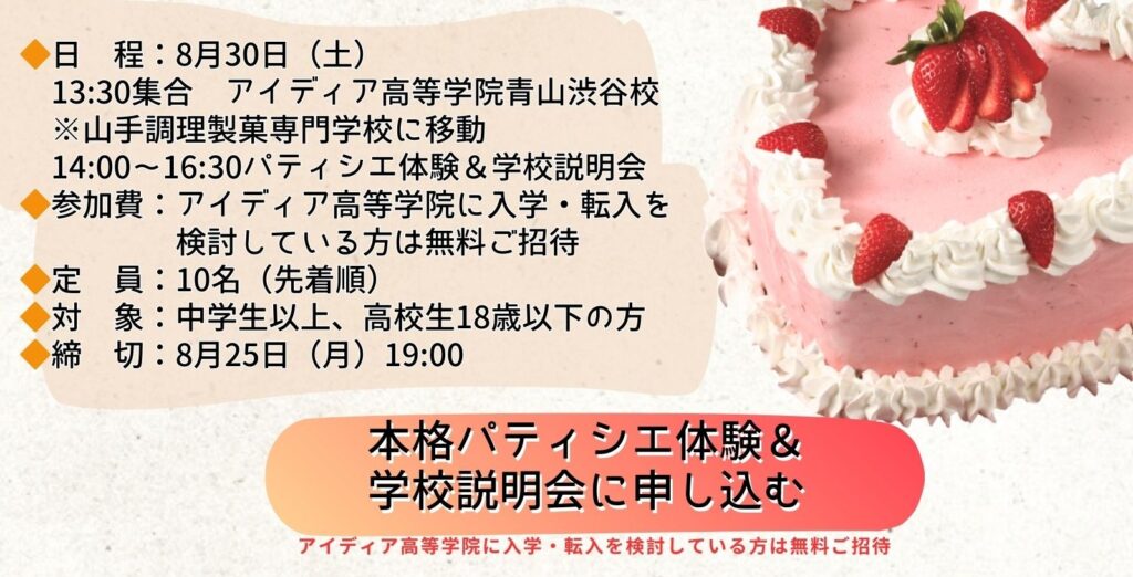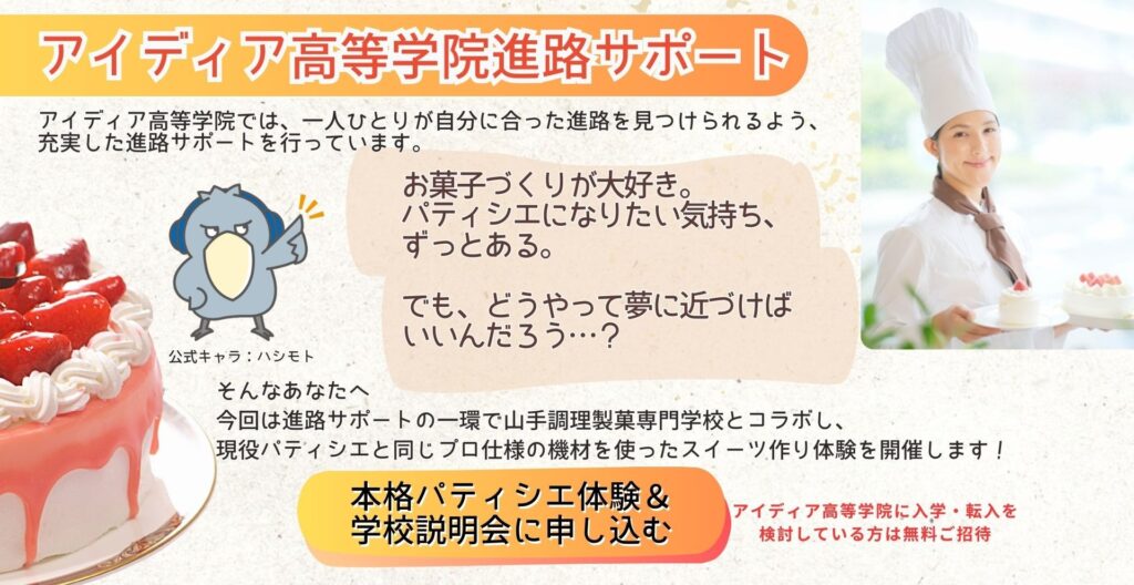 山手調理製菓専門学校は、一流のパティシエや調理のプロを輩出する75年の歴史を誇り、プロとして通用する技術とマインドを身に着けることができる学校として、アイディア高等学院と提携しています。